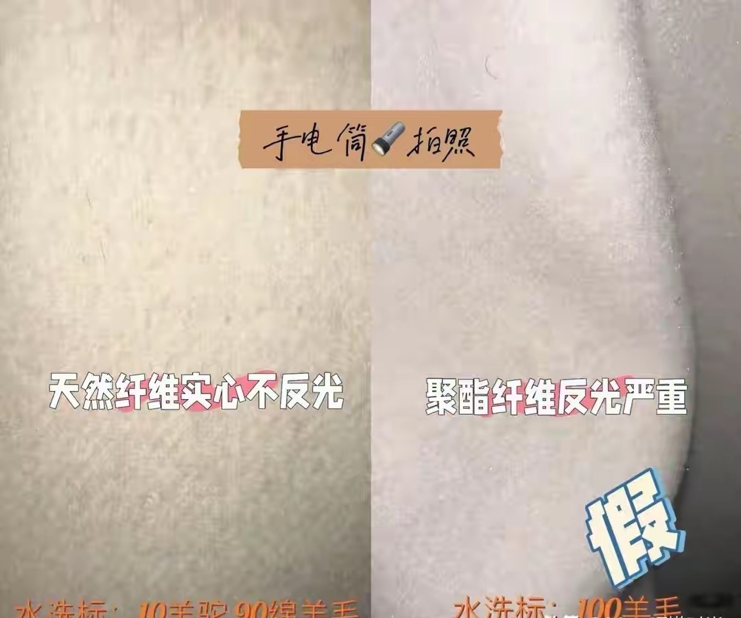 大衣的材质很多,但是天然纤维的实心款式,用手电筒照是不反光,如果是聚酯纤维,用手电筒照的时候反光很严重,大家可以根据这种小技巧来测试一下就知道了。