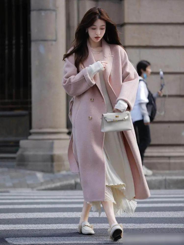 想要自己的穿搭更有朝气,咱们可以选择一件粉色的长款大衣外套,穿在身上就可以很好的修饰肤色,显白显嫩,内搭一件针织衫,再加上一条白色的百褶半身裙,脚上穿的白色的乐福鞋,让你轻松变美,显年轻。