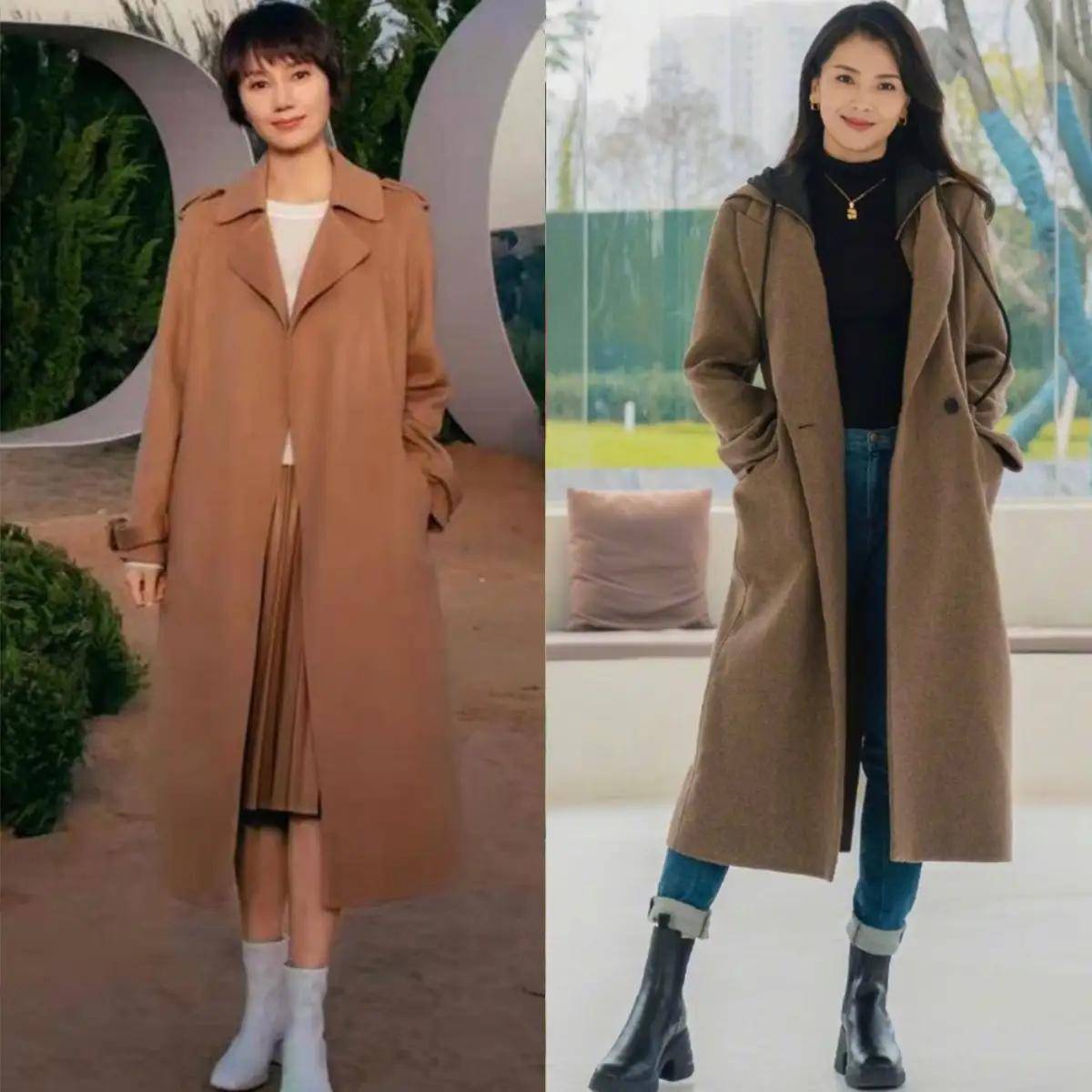 当然,你也可以像刘涛一样,用一件浅驼色的大衣外套内搭黑色针织毛衣和一条九分的牛仔裤,脚上穿的一双黑色的短靴,这样的造型会比较酷。