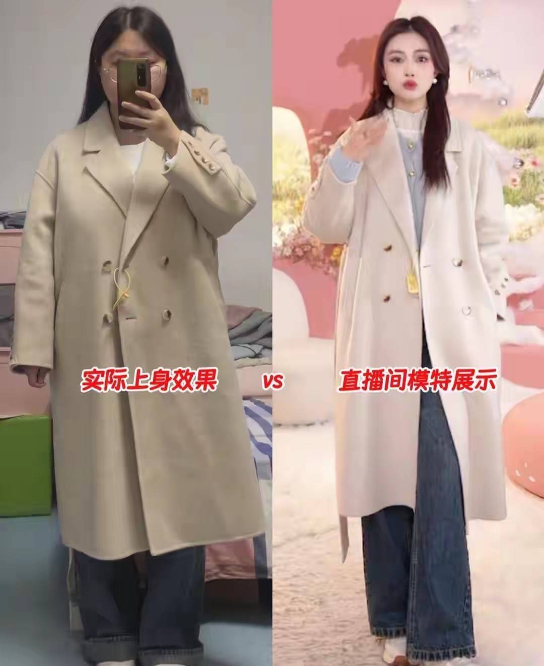 同样是大衣搭配牛仔裤,但是衣服的版型和色差真的有点大,咱们就看上面这两件衣服直播间模特展示的效果是米白色的大衣。