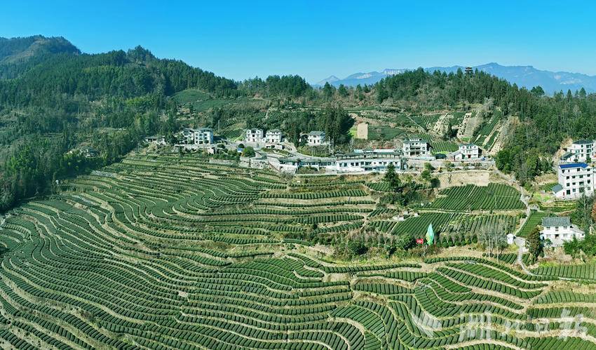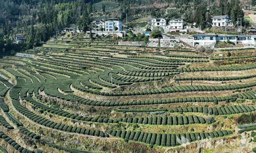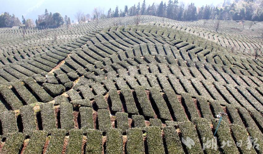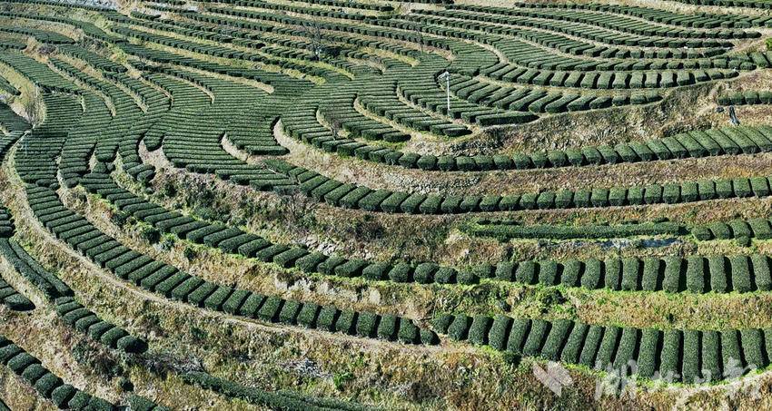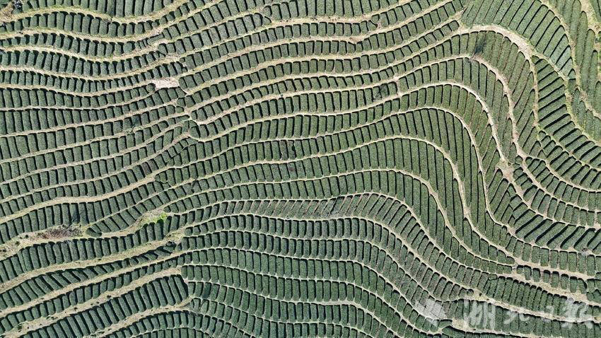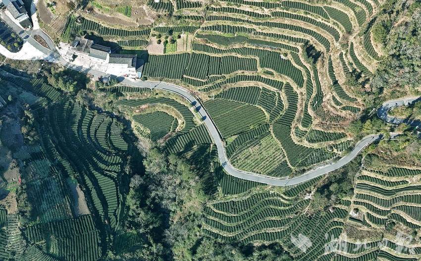 从空中俯瞰,茶垄随山势蜿蜒起伏,墨绿的茶树排列成行,宛如大地上的“五线谱”;白墙黛瓦的民居点缀于茶垄之间,与黄绿交织的田野相映成趣,乡野的烟火气与茶山的宁静和谐共存。虽已寒冬,茶树依然青翠,在晴光下舒展枝叶,静待春来吐新芽。